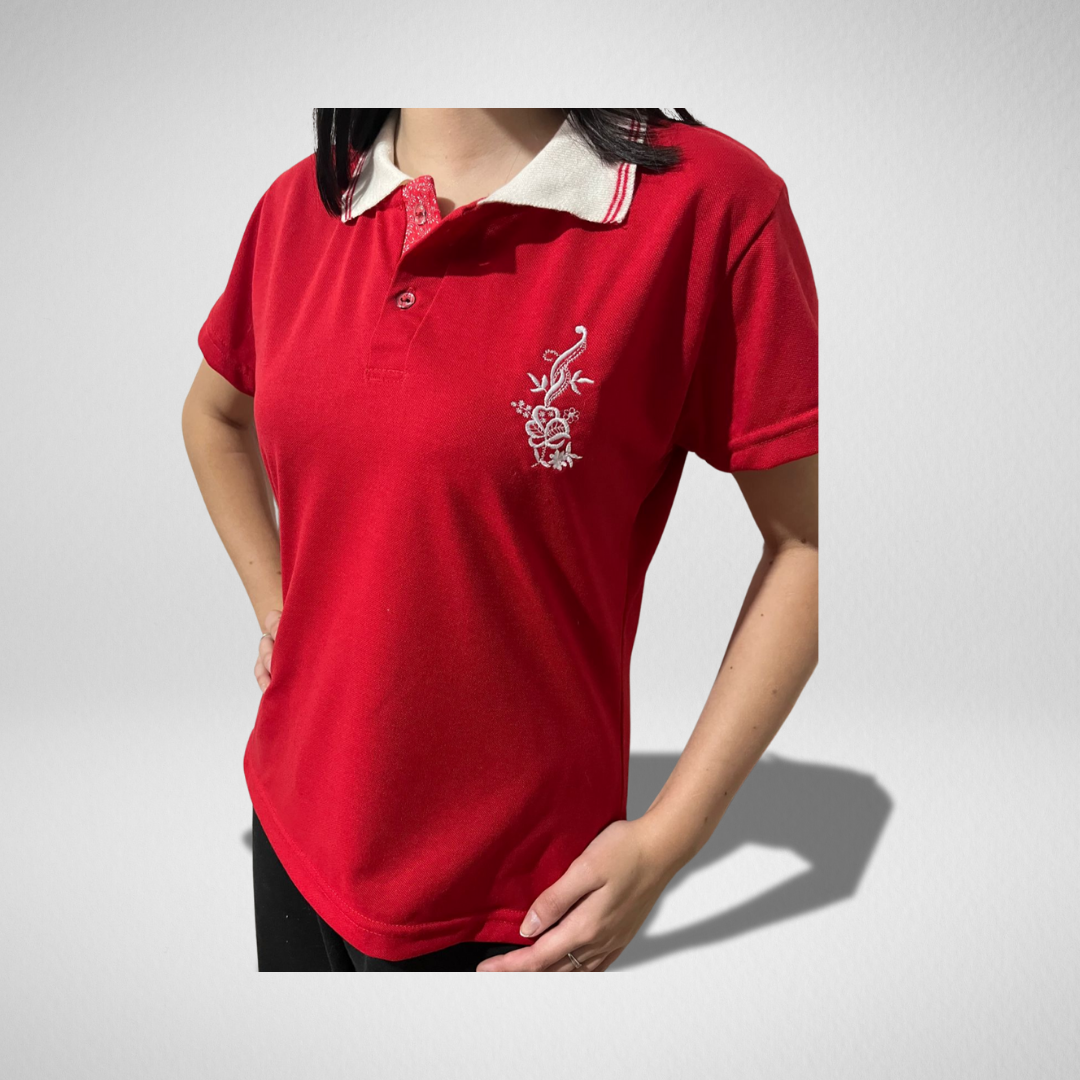 Camisa Polo feminina vermelha com detalhes e bordado.