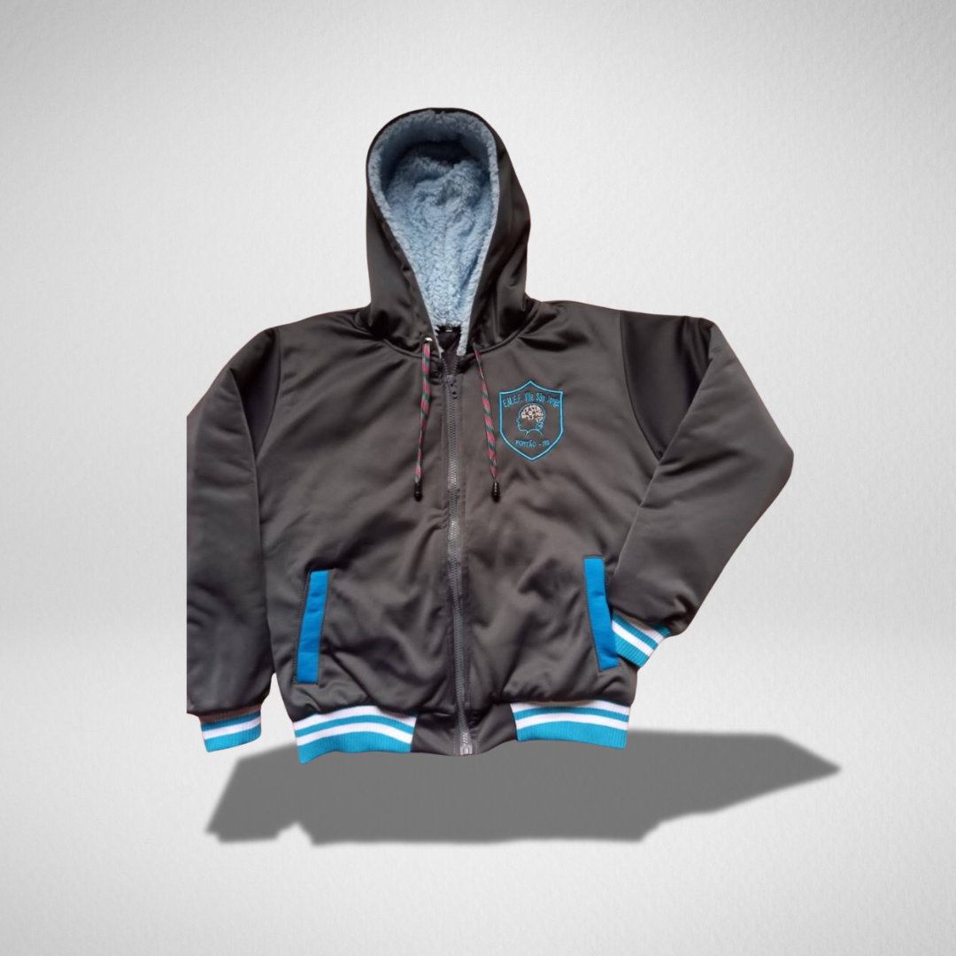 Casaco americano de chimpa cinza com forro de soft, zíper e capuz, da escola Vila São Jorge.
