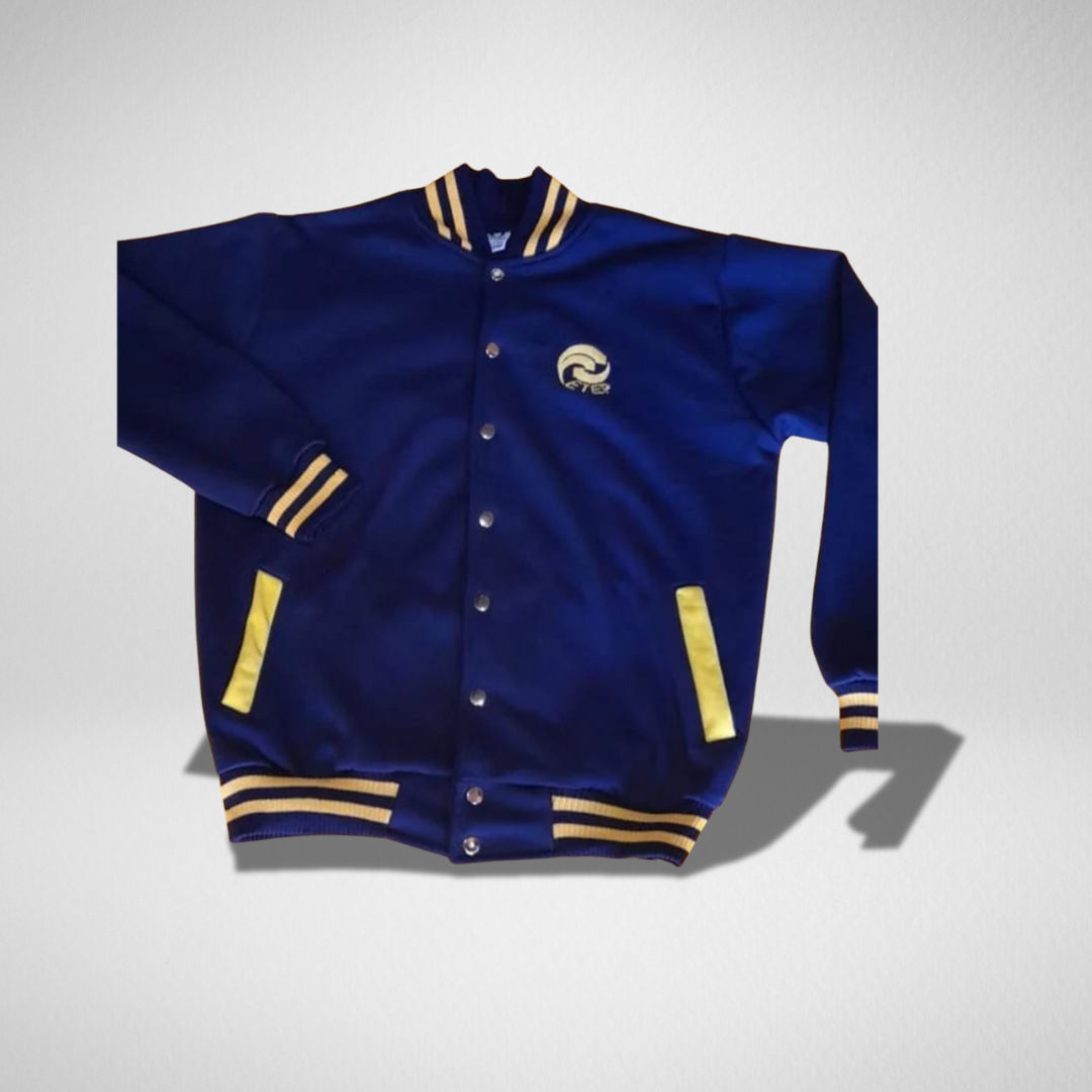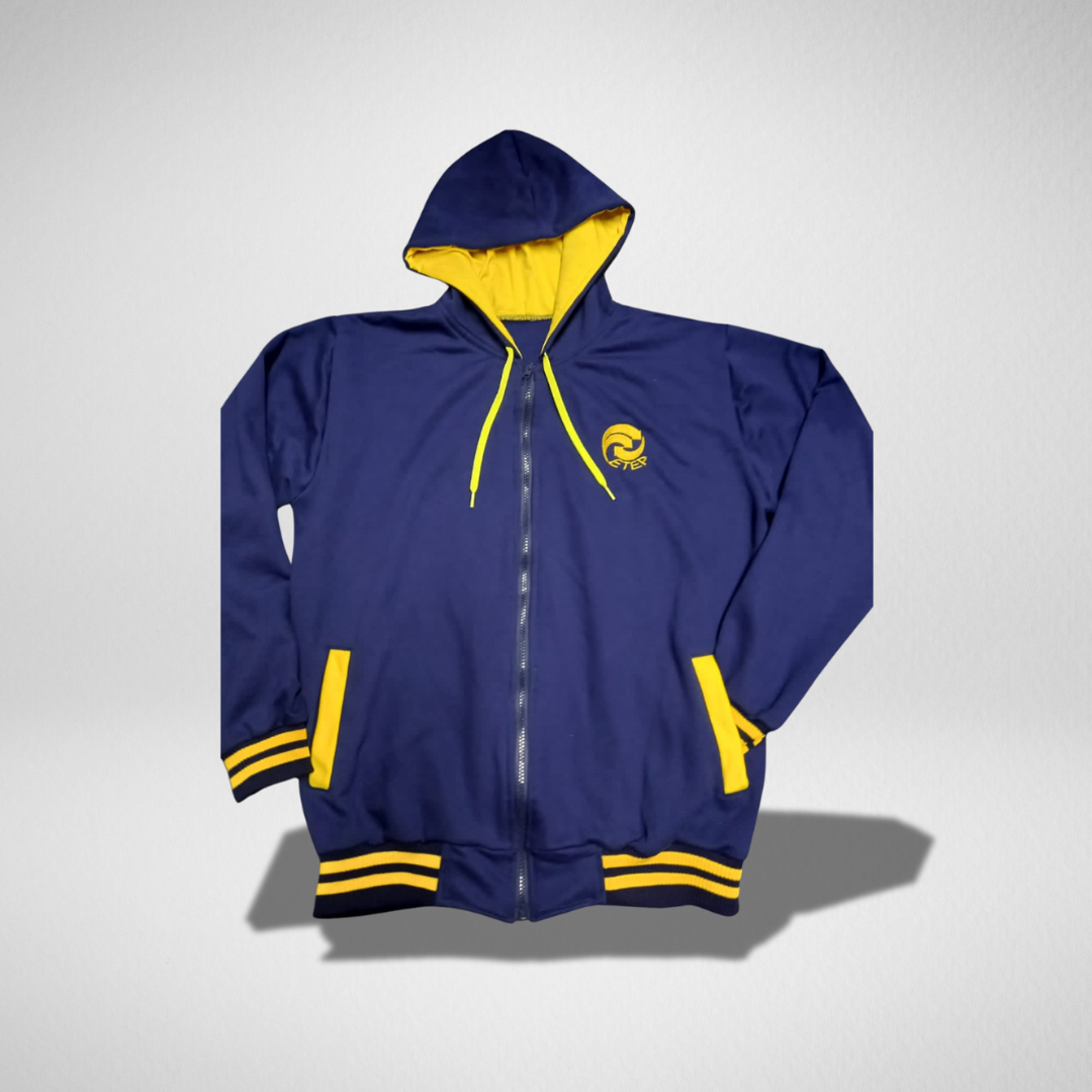 Casaco americano tradicional da ETEP. Moletom azul marinho com detalhes amarelo com botões de níquel ou zíper e capuz.