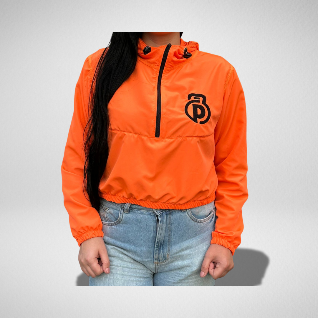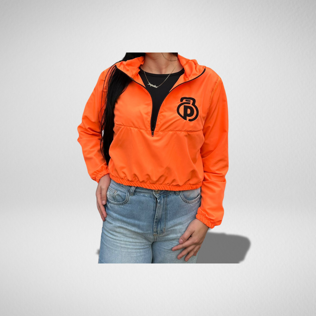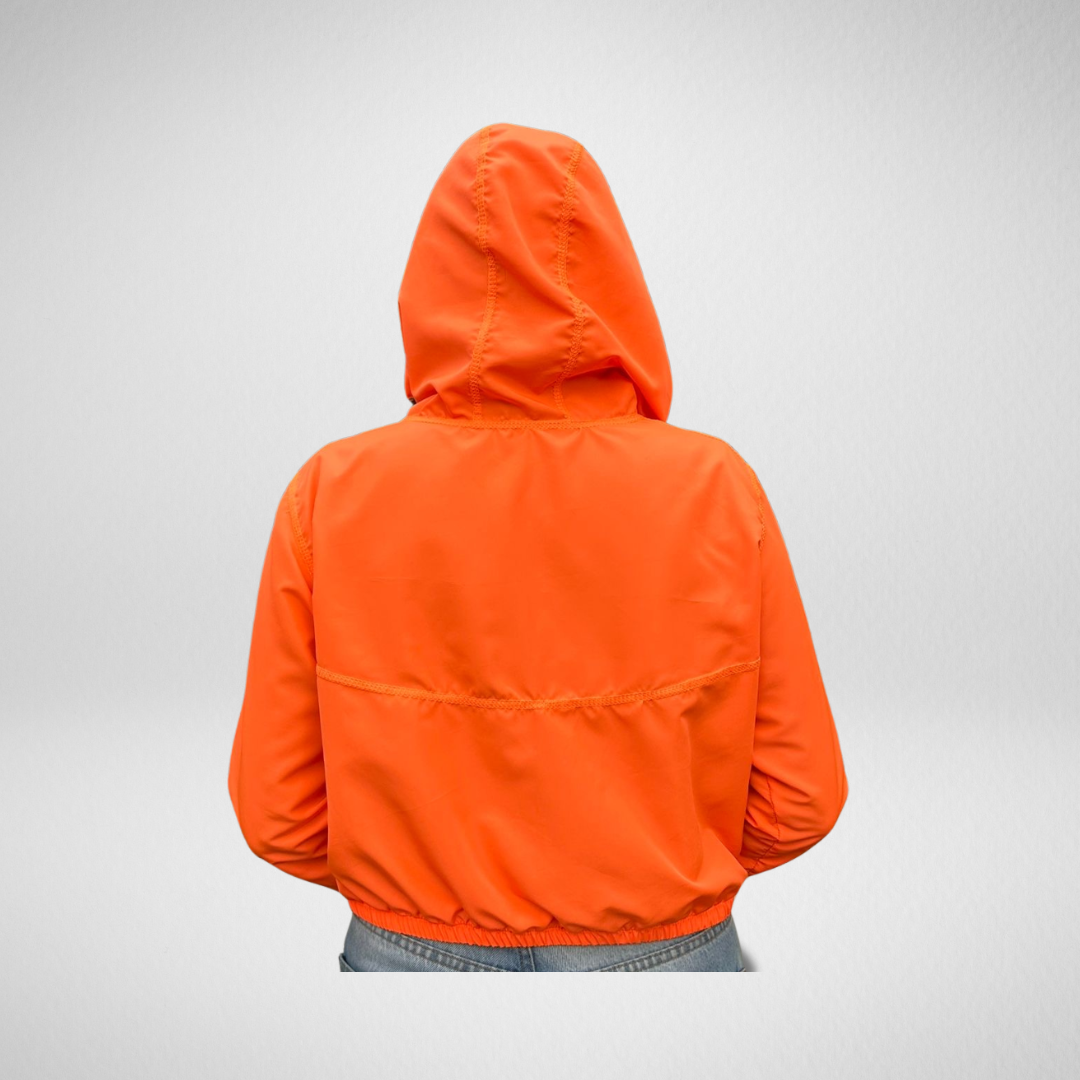 Corta-vento cropped feminino laranja neon.